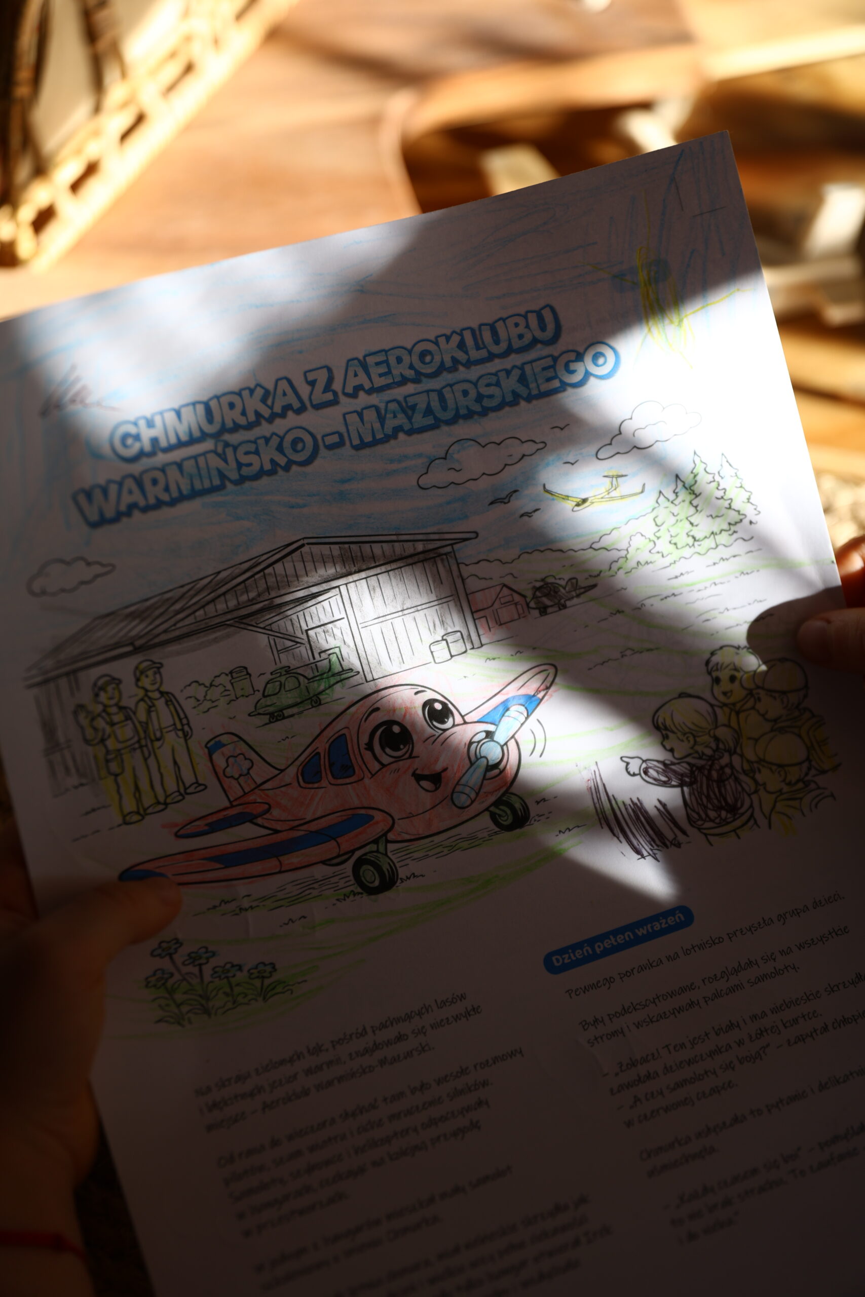 Stworzyliśmy także autorską bajkę o „Chmurce” z Aeroklubu Warmińsko-Mazurskiego. Każde dziecko otrzymało kredki, bajkę i malowankę z bohaterami naszego klubu – Irkiem, Przemkiem, Bogdanem i Jarkiem. Bo wierzymy, że wyobraźnia to pierwszy krok do lotu.